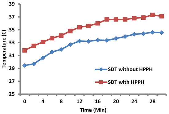 - Increase in tumor temperature (hyperthermia) during SDT: HPPH 1 at a dose of 0.47 µm/kg was injected into the tail vein of a PC3 = tumor-bearing mouse at 24 h prior to SDT. Sonodynamic therapy was carried out at the ultrasound dose of 3 MHz for 30 min with the temperature probe inserted directly into the tumor. In the control mice, the same procedure was followed except no HPPH in 1% Tween formulation was injected prior to SDT. The results shown in Figure 10 indicate an increase of 4–5 °C in tumor temperature on exposing the tumors with and without the presence of the PS (HPPH). The intra-tumoral temperature in mouse 1 (US alone) increased from 29 to 34 °C and in mouse 2 (US + HPPH), it increased from 31 to 37 °C.