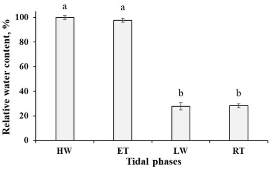Dynamics of relative water content in the thalli of Pelvetia canaliculata during the tidal cycle. HW—high water; ET—ebb tide; LW—low water; RT—rising tide. Means are given with ±SD (n = 12–20); different letters indicate significant differences (p < 0.05, Student’s t-test).