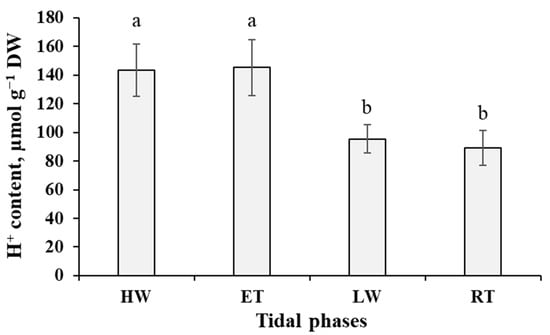 Dynamics of titratable acidity of the thalli of Pelvetia canaliculata during the tidal cycle. HW—high water; ET—ebb tide; LW—low water; RT—rising tide. Means are given with ±SD (n = 10–12); different letters indicate significant differences (p < 0.05, Student’s t-test).