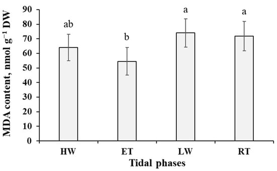 Dynamics of malondialdehyde (MDA) content in the thalli of Pelvetia canaliculata during the tidal cycle. HW—high water; ET—ebb tide; LW—low water; RT—rising tide. Means are given with ±SD (n = 6); different letters indicate significant differences (p < 0.05, Student’s t-test).