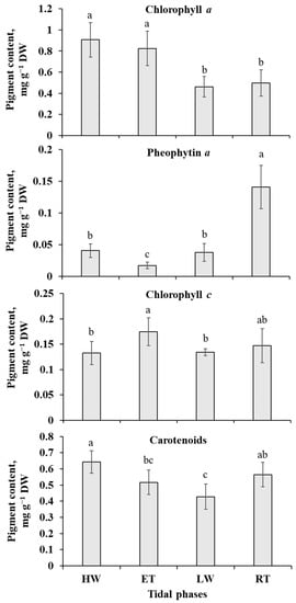 Dynamics of photosynthetic pigments content in the thalli of Pelvetia canaliculata during the tidal cycle. HW—high water; ET—ebb tide; LW—low water; RT—rising tide. Means are given with ±SD (n = 6); different letters indicate significant differences (p < 0.05, Student’s t-test).