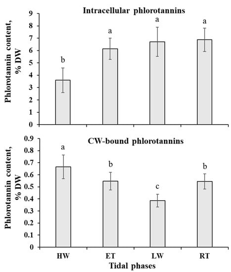 Dynamics of intracellular and cell wall (CW)-bound phlorotannin content in the thalli of Pelvetia canaliculata during the tidal cycle. HW—high water; ET—ebb tide; LW—low water; RT—rising tide. Means are given with ±SD (n = 8–12); different letters indicate significant differences (p < 0.05, Student’s t-test).