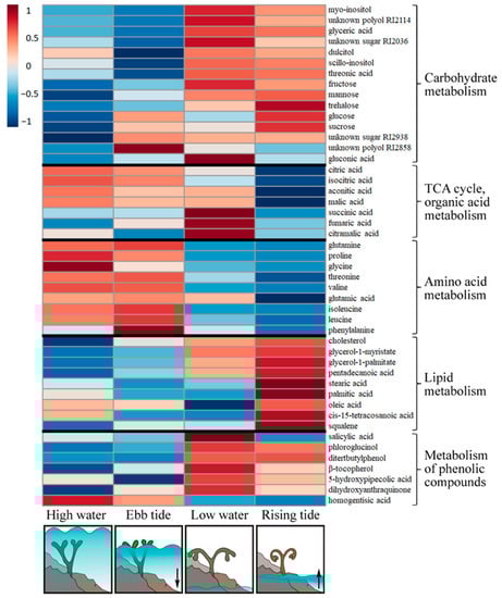A heatmap of significantly (p < 0.05) changing key metabolites detected in the thalli of Pelvetia canaliculata during the tidal cycle. Mean area values of five samples are presented on a log10 scale. Arrows mean direction of the tidal current.