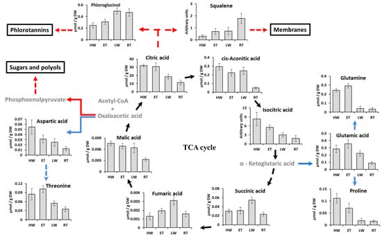 Presumable consumption pathways of TCA cycle metabolites in the cells of Pelvetia canaliculata during different tidal phases. Blue lines indicate the pathways activated in the water (high water, HW and ebb tide, ET), red lines indicate the pathways activated in the air (low water, LW and rising tide, RT). Direct reactions are presented as straight lines, and reactions involving several steps are presented as dashed lines. Metabolites which were not determined are labeled in grey. Bars represent the means ± SD. Arbitrary units are normalized peak areas of extracted ion chromatograms.
