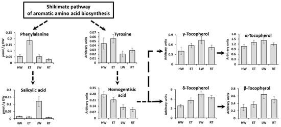 Scheme of the salicylic acid and tocopherols biosynthesis. Direct reactions are presented as straight lines and reactions involving several steps are presented as dashed lines. HW—high water, ET—ebb tide, LW—low water, RT—rising tide. Bars represent the means ± SD. Arbitrary units are normalized peak areas of extracted ion chromatograms.
