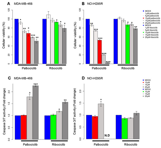 Analysis of cellular viability and apoptosis in pRb-deficient cell lines. (A) The viability of cells is measured after 48 h of treatment with increasing doses of palbociclib or ribociclib in MDA-MB-468 cells and (B) in NCI-H295R cells. (C) Histograms representing the activity of caspase3/7 after treatment with palbociclib or ribociclib in MDA-MB-468 cells and (D) in NCI-H295R cells. N.D = Non determined. Two or more independent experiments were performed for each condition (The statistical significance was tested with t-test; * p < 0.05, ** p < 0.01, *** p < 0.001).