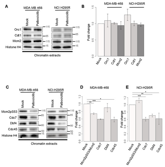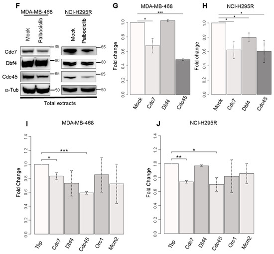 Analysis of chromatin loading of pre-ICs proteins and expression levels of Pre-IC genes in MDA-MB-468 and NCI-H295R cells treated with palbociclib. (A) The fraction of proteins of the pre-RC bound to chromatin was analyzed via Western blotting. The same number of cells are used for fractionation at each condition. Histone H4 is a loading control. (B) Histogram representing the relative level of pre-RC proteins loaded on chromatin. (C) Histogram representing the relative level of pre-RC proteins loaded on chromatin. (D) Histogram representing the relative level of pre-IC proteins loaded on chromatin in MDA-MB-468 cells and (E) in NCI-H295R cells. Two independent experiments were performed for each condition. (statistical significance; * p < 0.05, ** p < 0.01, *** p < 0.001). (F) The total level of pre-initiation complex proteins was analyzed via Western blotting. The same number of cells was loaded for each condition. α-Tubulin is a loading control. (G) Histogram representing the relative total amount of proteins in MDA-MB-468 cells and (H) in NCI-H295R cells. (I) Histograms representing fold change of gene expression level for MDA-MB-468 cells treated with palbociclib for 24 h and (J) for NCI-H295R cells treated with palbociclib for 48 h. The level of the TATA-box-binding protein (Tbp) was considered as a control and assessed as 1, from which expression of the other genes was normalized. Two independent experiments were performed for each condition (statistical significance; * p < 0.05, ** p < 0.01, *** p < 0.001).