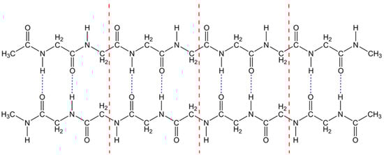 Structure of the polyglycine dimer. The β-sheet polyglycine dimer is formed by β-strands of polypeptides with four links (Dim4), each containing two interchain hydrogen bonds. Red dash-dotted lines separate the adjoining links. Blue short-dashed lines indicate interchain hydrogen bonds.