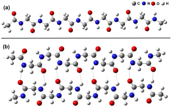 B3LYP/6-31G(d) optimized structure of polyglycyne: (a)—monomer Mon4 and (b)—dimer Dim4. The atomic symbols: C—grey, O—red, N—blue, and H—white. The dashed lines indicate interchain hydrogen bonds.