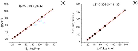 The Arrhenius parameters calculated using Equations (8) and (9) are shown in Figure 4a. The entropy and enthalpy of activation, presented in Figure 4b, were calculated according to Equations (A1) and (A2) in Appendix A. As seen in Figure 4, the calculated Arrhenius parameters vary within very broad intervals, e.g., the activation energy (Ea) values lie between 20 and 140 kcal/mol, and the pre-exponential factors (A) between 1021 and 10105 s−1. Figure 4 demonstrates the very consistent EEC effect in a row of dimers of varied lengths.
