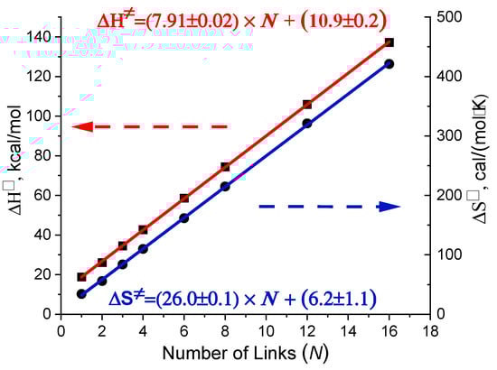 Calculated enthalpy and entropy of activation as a function of the number of links (N) in dimers. Parameters of the linear fits of the presented data are given in the color of corresponding line.