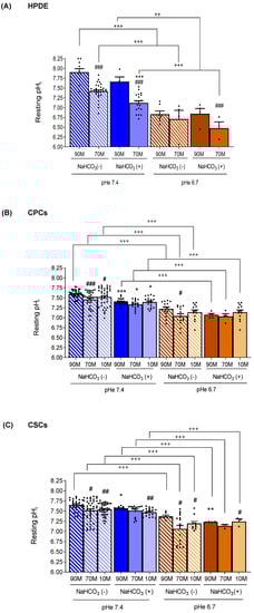 Effect of the ECM composition (from a less fibrotic to a more fibrotic ECM) and different pHe (pHe 7.4 and pHe 6.7) in the presence (NaHCO3 (+)) or absence of NaHCO3 (NaHCO3 (−)) on resting pHi. The cells were alternatively perfused with Ringer with and without NaHCO3 (see Supplementary Table S1) at both pHes to determine the effect of the changing pHe and the presence or absence of NaHCO3 on resting pHi. (a) The normal HPDE cells (A) were grown on a matrix resembling the normal pancreatic ECM (90M-10C) and a low fibrotic ECM (70M-30C), while the tumor cells (B) CPCs and (C) CSCs, concordant with the increasing level of desmoplasia in fully established PDAC, were also grown on a highly fibrotic ECM (10M-90C). Significance between groups: # p < 0.05; ## p < 0.01; ### p < 0.001 compared to 90M in the same NaHCO3/pHe conditions; * p < 0.05; ** p < 0.01; *** p < 0.001 comparing NaHCO3 (+) versus NaHCO3 (−) on the same ECM/pHe; ++ p < 0.01; +++ p < 0.001.