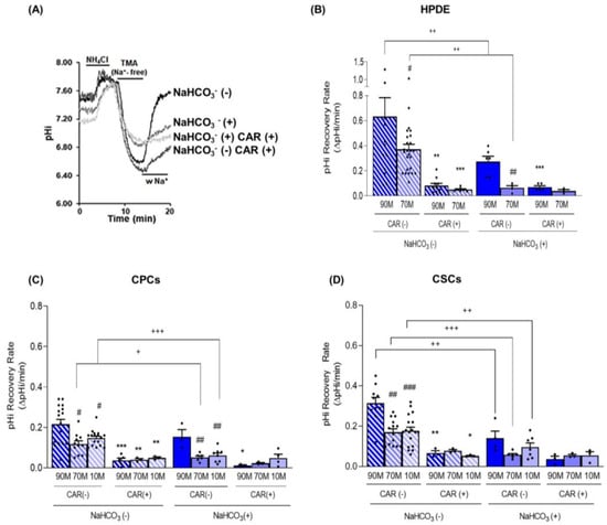 (A) Representative traces of the pHi recovery rate from an NH4Cl prepulse-induced acidification in HPDE 3D organotypic cultures labelled with the pH-sensitive probe BCECF. The experiment was performed according to the Boron protocol (please see Materials and Methods) with or without NaHCO3 ((NaHCO3 (+) or NaHCO3 (−), respectively), and in the absence (CAR (−)) and presence (CAR (+)) of Cariporide (5 µM) during the pH recovery to evaluate the contribution of NHE1. In both the normal HPDE cells (B) and in the cancer cells, CPCs (C) and CSCs (D), the pHi recovery is always dependent on NHE1 activity in the absence of NaHCO3. Results are presented as mean ± SEM. Significance between groups: * p < 0.05; ** p < 0.01; *** p < 0.001 compared to their own pHi measured without Cariporide on the same ECM; # p < 0.05; ## p < 0.01; ### p < 0.001 compared to 90M-10C for each cell line; + p < 0.05; ++ p < 0.01; +++ p < 0.001.
