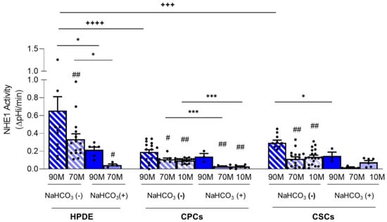 NHE1 activity calculated as the pHi recovery in control condition subtracted from pHi recovery in the presence of Cariporide for HPDE, CPC and CSC cell lines. Significance between groups: # p < 0.05; ## p < 0.01 compared to 90M-10C for each cell line; * p < 0.05, *** p < 0.001; +++ p < 0.001 and ++++ p < 0.0001.