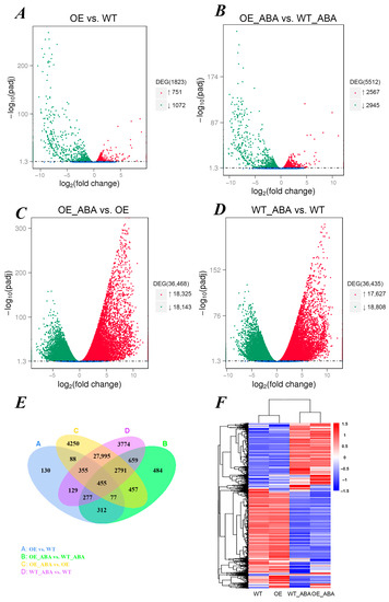 Four-day-old seedlings treated with 10 mM ABA for 6 h were selected for further transcriptome analyses. Three biological replicates were sampled for each group (WT, OE, WT_ABA, OE_ABA). A total of 12 samples of leaf tissue (more than 30 seedlings per sample) were collected with the same growth status and stored at −80 °C for further experiments. Total RNA was isolated by using TRIzol reagent (Invitrogen, Burlington, ON, Canada). Preparation of libraries and sequencing of transcriptomes were carried out using an Illumina HiSeq X Ten (Novogene, Beijing, China).