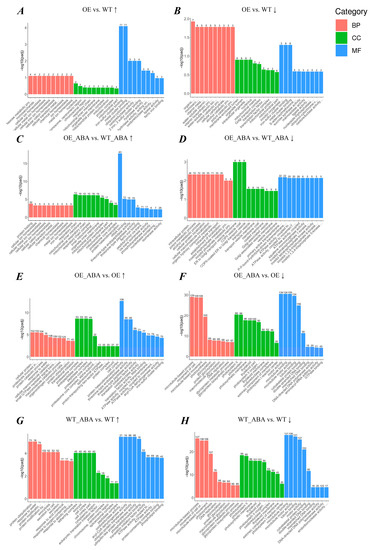 GO enrichment histogram of DEGs. The top 10 significantly enriched GO terms in each GO term category obtained from pairwise transcriptome comparison. If there are fewer than 10 terms per category, all terms are displayed. The ordinate was –log10 (padj), which refers to adjusted p-value after multiple hypothesis testing correction. The value range of padj is [0, 1], and the closer to zero, the more significant the enrichment. The abscissa is the description of the GO term. The number of differential genes in the specific GO term is shown above each bar. Different colors are used to distinguish biological processes, cellular components, and molecular functions. (A–H) The histogram of DEGs from 4 pairwise comparison groups. “↑” represents the up-regulated DEGs, “↓” represents the down-regulated DEGs.