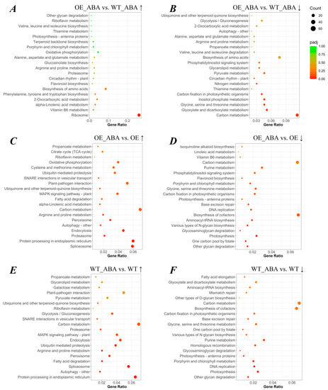 Significant enrichment of KEGG pathways can determine the most important biochemical metabolic pathways and signaling pathways that DEGs participate in. Among all transcriptome data, 39,510 genes could be annotated with 117 KEGG terms. The term including the largest number of DEGs (278) was hormone signal transduction. We found the number (n = 52) of DEGs annotated as ribosome was the greatest in the “BnSIP1-1-affected” group (Figure S2A,B), while carbon metabolism had the most DEGs annotated among the “ABA-affected” group, with 150 genes annotated (Figure S2C,D). Exogenous ABA up-regulated the genes related to ubiquitin-mediated proteolysis in both WT plants and OE plants; meanwhile, this KEGG term was more enriched in the WT line than the OE line, with p-values of 0.004 and 0.065, respectively (Figure 3C,E). The down-regulated “BnSIP1-1-affected” DEGs which were assigned to circadian rhythm, inositol phosphate metabolism, phosphatidylinositol signaling system, and autophagy had a great degree of enrichment after ABA treatment because of the superposition effect of ABA and BnSIP1-1 (Figure 3B). DEGs involved in the phosphatidylinositol signaling system and isoquinoline alkaloid biosynthesis had a lower expression level after ABA treatment in OE plants than in WT plants (Figure 3D). There were no significantly enriched terms identified in the comparison of OE vs. WT by KEGG analysis, so the data of this comparison are not presented in Figure 3. Taken together, KEGG analysis indicated BnSIP1-1 may affect ABA-related genes by regulating the activity of molecules which are involved in different pathways, including ubiquitin-mediated proteolysis, inositol phosphate metabolism, the phosphatidylinositol signaling system, and autophagy.