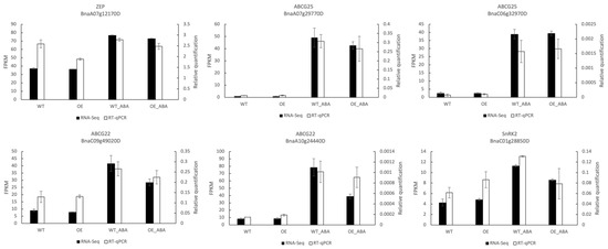 To verify the accuracy of RNA-seq, six genes were selected for RT-qPCR assay. These selected genes were related to ABA metabolism and transport, including one ABA synthesis ZEP (BnaA07g12170D), two ABA exporter ABCG25 (BnaA07g29770D and BnaC06g32970D), two ABA importer ABCG22 (BnaA10g24440D and BnaC09g49020D), and one serine/threonine protein kinase gene SnRK2 (BnaC01g28850D). The RNA sample was obtained in the same way as those used in RNA-seq. The results indicated that change pattern of the selected genes was similar between RNA-seq and RT-qPCR, confirming the validity and reliability of our RNA-seq data and our findings (Figure 4).
