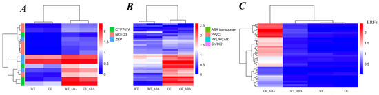 Hierarchical cluster analysis of ABA-related genes in transcriptome. The FPKM value was normalized by log10 (FPKM + 1) and clustered. Red indicates highly expressed genes and blue indicates poorly expressed genes. The color change from red to blue indicates a descending gene expression level. (A) Expression pattern of genes related to ABA metabolism and biosynthesis. (B) Expression pattern of genes related to ABA transport and signaling pathway. (C) Expression pattern of ERFs (Ethylene Response Factors) found in OE and WT with or without ABA treatment.