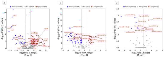 Volcano plots for expressed (A) known sRNA, (B) novel sRNA, and (C) mature miRNAs in peripheral blood mononuclear cells (PBMCs) in J1 (before therapy) and J2 (after maintenance therapy) samples. Red (upregulated) and blue (downregulated) circles indicate genes with significant differences, whereas gray circles represent genes without significant differences.