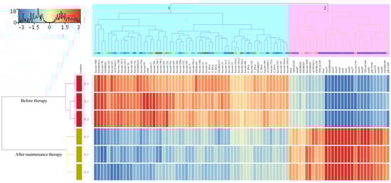 Extraction of sRNA, library preparation using the TruSeq sRNA Sample Preparation Kit (Illumina, San Diego, CA, USA), and sequencing on the MiSeq platform were performed according to the manufacturer’s instructions (Illumina, San Diego, CA, USA) and a previous protocol [,]. Only high-quality sequencing reads with a Sanger score of 30 or higher were considered for further analysis. Reads were aligned to the whole genome build hg19 using Strand NGS version 3.1 software (Strand Life Science, Bengaluru, India) according to the sRNA alignment and analysis pipeline using default parameters. The distributions of sRNA data in each sample were performed according to the quantile normalization algorithm []. In addition, only sRNA sequences that met the minimum read coverage criterion of >5 were considered novel or known sRNA and included in further analyses. The initial analysis showed that the numbers of reads assigned to different gene regions for J1 and J2 were 3,416,083 and 14,018,875, respectively. The median number of reads that passed quality control for J1 and J2 samples were 2,426,809 and 2,413,440, respectively. Before expression analysis, the Shapiro–Wilk method was used to test the normal distribution of the cleaned data (Shapiro–Wilk P > 1.0) in each sample to ensure that only normally distributed data were considered for further analysis. Reads were then normalized using the quantile normalization algorithm [] with the baseline transformation set to the median value for both samples. We obtained 15,062 of all entities after quantification. Among them were 9945 known genes, 115 novel genes, and 5002 active miRNAs. To identify differentially expressed sRNAs, the read count file of the J1 and J2 files was analyzed using DESeq2, which is included in the Strand NGS version 3.1 package. This analysis identified 91 known sRNAs that were significantly dysregulated before therapy, of which 60 were upregulated and 31 were downregulated, with fold-change values (FC) ≥ 2.0 (Figure 1A, and Supplemental Table S1). The differential expression pattern of these genes in the hierarchical clustering shown in the heatmap in Figure 2 revealed two large clusters in which the J1 and J2 samples could be accurately distinguished.