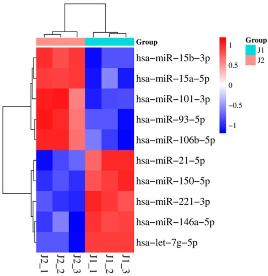 Heatmap showing the results of hierarchical cluster analysis for the two sample groups and the 10 significantly dysregulated mature miRNAs. The sample cluster tree is shown at the top, with the miRNA cluster tree on the left forming two main clusters. The color scale indicates the relative expression level of miRNAs in the J1 and J2 samples.