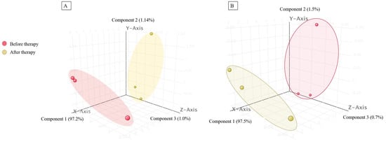 Three-dimensional representation of principal component analysis showing the differences between the J1 (before therapy) and J2 (after maintenance therapy) samples based on (A) the 91 significantly deregulated known sRNAs and (B) the 11 significantly deregulated miRNAs.
