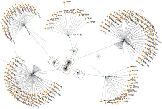 An interaction network between the most deregulated mature miRNAs and their target genes was generated using MirWalk v3. Blue circles represent miRNAs; orange circles represent mRNAs. The more connections there are between miRNAs and genes, the more connections there are in the network.