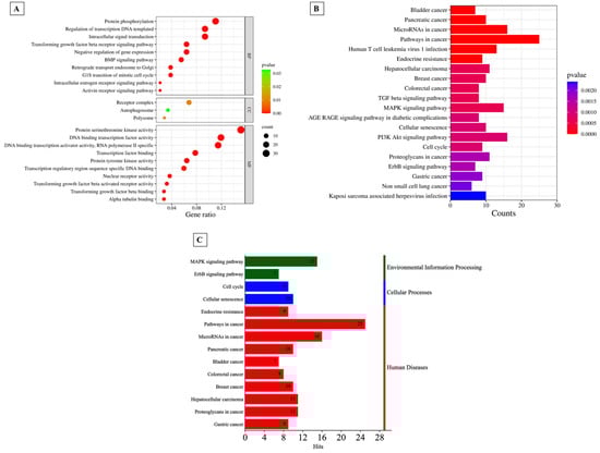 (A)Top 10 items of GO BP, GO MF, and all significantly computed GO CC shown in the bubble plot according to adjusted p value. (B) Classification of the pathways into 3 categories: environmental information processing, cellular processes, and human diseases. (C) Histogram of KEGG pathway annotation of the target genes in ATLL after maintenance therap.