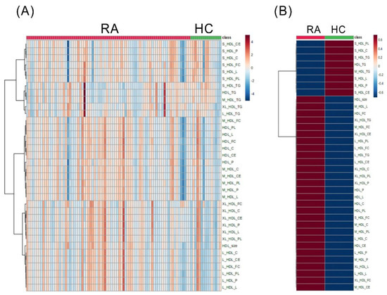 The differences in the levels of discriminant HDL-related metabolites between RA and HC subjects. Classification of subjects according to lipidomic data heatmap representing relative amounts (A) and the mean levels (B) of discriminant HDL-related metabolites between rheumatoid arthritis (RA) and healthy control (HC) subjects. Each metabolite’s level is color-coded on a normalized scale ranging from a minimum of −4 (dark blue) to a maximum of 4 (dark red). Rows indicate HDL-related metabolites and columns indicate subjects.