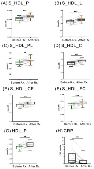 Fourteen patients were available for examination of HDL-related metabolites before and after 6–12 months of therapy with Janus kinase inhibitors (JAKi), including twelve patients receiving tofacitinib and two receiving baricitinib. Figure 4 illustrates that the treatment with JAKi resulted in a significant augmentation in serum levels of total HDL particle number (HDL_P) and small-sized HDL particle number (S_HDL_P) and small-sized HDL-related metabolites, including total lipids, phospholipids, cholesterol, cholesterol ester, and free cholesterol (S_HDL_L, S_HDL_PL, S_HDL_C, S_HDL_CE, and S_HDL_FC). This enhancement was concomitant with a reduction in disease activity, as indicated by CRP levels (median 0.95 mg/dL, interquartile range (IQR) 0.33–2.92 mg/dL versus 0.14 mg/dL, IQR 0.05–0.96 mg/dL, p <0.005).