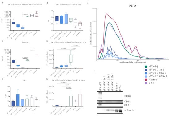 Small EV concentration (A), vesicle size (B), spectrum of vesicle size (C), protein concentration (D), vesicle to protein ratio (E), RNA concentration (F), vesicle to RNA ratio (G), and expression of CD63, CD81, CD9 and albumin (H) in sEVs-EQ, sEVs-UC 1 mL, sEVs-UC 0.5 mL, sEVs-UC 0.25 mL, microvesicles (MVs) and plasma.