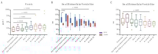 Small EV protein concentration in the overall patient cohort (A), small EV size in ADSC and placebo patients (B), and the overall patient cohort (C).