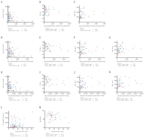Correlation of small EV concentration/mL with troponin (A), EF (B), and ESV (C). Correlation of small EV to protein ratio with troponin (D), EF (E), ESV (F) and EDV (G). Correlation of small EV to RNA ratio with troponin (H), EF (I), ESV (J), EDV (K). Correlation of small EV protein to RNA ratio with NT-proBNP (L) and EQ-5D-5L (M).