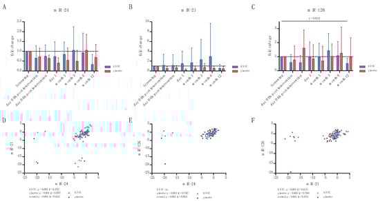Small EV miR-24 (A), miR-21 (B), and miR-126 (C), and correlations amongst themselves (D–F).