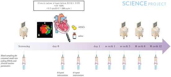 - Paitazoglou, C.; Bergmann, M.W.; Vrtovec, B.; Chamuleau, S.A.J.; van Klarenbosch, B.; Wojakowski, W.; Michalewska-Wludarczyk, A.; Gyongyosi, M.; Ekblond, A.; Haack-Sorensen, M.; et al. Rationale and design of the European multicentre study on Stem Cell therapy in IschEmic Non-treatable Cardiac diseasE (SCIENCE). Eur. J. Heart Fail. 2019, 21, 1032–1041. [Google Scholar] [CrossRef]