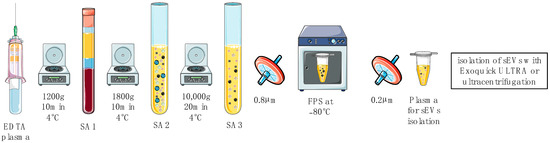 For small EV isolation, EDTA plasma was obtained and subjected to sequential centrifugation prior to the isolation (Figure 7). Firstly, EDTA blood was centrifuged at 1200× g for 10 min at 4 °C; secondly, the supernatant (SA1) was transferred to a new tube and another centrifugation step at 1800× g for 10 min at 4 °C was performed. The last centrifugation step was performed after transferring the supernatant (SA2) to new vials at 10,000× g for 20 min at 4 °C. Then, the supernatant (SA3) was filtered through 0.8 μm surfactant-free cellulose acetate filters (16592, Sartorius, Goettingen, GER). Final plasma samples (FPS) were stored at −80 °C until further processing. The pellet after the last centrifugation step was defined as microvesicles (MVs) for further experiments.