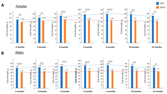Grip strength analysis of the matched WT and homozygous DMSXL mice ((A) females and (B) males) from 2 to 12 months of age. The number of mice in each group is shown at the top. **, ***, **** and ***** are p values of <0.01, 0.001, 0.0001 and 0.00001, respectively.