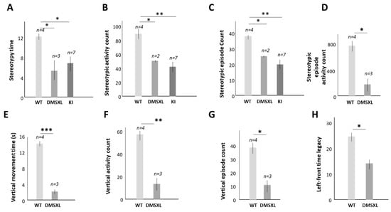 The stereotypy time (A), stereotypic activity counts (B) and stereotypic episode count (C) are reduced in the matched homozygous DMSXL and CUGBP1 KI mice vs. WT mice (males, 1 month). Open field test was performed with naive mice for 5 min. Homozygous DMSXL mice (males, 1 month) also show reduced stereotypic episode activity count (D), vertical movement time (E), vertical activity count (F), vertical episode count (G) and left-front time legacy (H) relative to matched WT mice. The number of mice is shown at the top. *, ** and *** are p values of <0.05, 0.01 and 0.001, respectively.