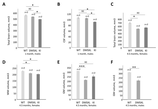 In addition, the volume of Cerebral Spinal Fluid (CSF) was reduced in 1-month-old CUGBP1 KI mice (Figure 5B). No significant changes in the CSF volume were identified in the matched DMSXL mice. These data show that the accumulation of inactive CUGBP1REP in homozygous CUGBP1 KI mice caused a reduction in brain volume at a young age. A similar analysis showed that adult (4.5 months) homozygous DMSXL mice were characterized by a strong loss of total brain volume (~23%) vs. matched WT mice (Figure 5C). The matched adult CUGBP1 KI mice also showed a ~20% reduction in total brain volume; however, this value is not significant, likely due to the variability of the values between mice. Thus, it appears that there is possible loss of brain volume in homozygous DMSXL mice in adulthood. Examination of the white matter (WM) volume showed that while no significant volumetric changes were observed in young CUGBP1 KI and DMSXL mice, there was a significant reduction in the WM volume in both adult DMSXL and CUGBP1 KI mice (Figure 5D), by approximately 8% in DMSXL brains and 11% in CUGBP1 KI brains. The grey matter (GM) volume was even more strongly reduced in adult DMSXL mice (by ~30%) vs. WT mice (Figure 5E). The GM volume was also reduced by ~19% in adult CUGBP1 KI mice; however, this change was not significant. The GM volume reduction in DMSXL mice was independent of gender because adult homozygous DMSXL mice (males) also showed about a 30% reduction in GM volume (Figure 5F), like the matched DMSXL females (Figure 5E). Taken together, these findings show that the increase in inactive CUGBP1REP due to the mutation of the GSK3β-CDK4 phosphorylation site in CUGBP1, and/or due to the expression of the mutant CUG repeats in DMSXL mice [22], causes an approximately comparable reduction in WM volume.