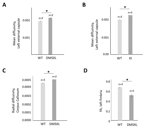 Mean diffusivity is increased in left external capsule in homozygous DMSXL (A) and CUGBP1 KI mice (B) vs. matched WT mice. In (A), two groups of matched 4.5-month-old WT and DMSXL mice (males) were used, while in (B), two groups of WT and DMSXL mice (females) were examined. (C) Radial diffusivity is increased in corpus callosum of 4.5-month-old homozygous DMSXL mice (males) vs. matched WT mice. (D) Fractional anisotropy is reduced in left fimbria of 4.5-month-old DMSXL mice (males). Three mice per group were analyzed. Standard deviations are shown. * p value < 0.05.