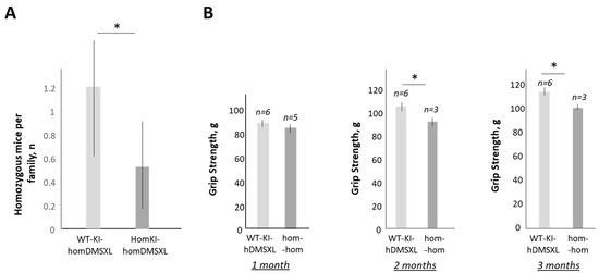 The effect of CUGBP1REP on the phenotype of DMSXL mice in the double-mutant CUGBP1-KI-DMSXL mouse strain. (A) The number of double-mutant homozygous mice per family is reduced vs. single-mutant DMSXL mice in CUGBP1-KI-DMSXL strain. A total of 23 families containing 232 mice were analyzed. * p value < 0.05. (B) Grip strength comparison of the single-mutant WT-CUGBP1-KI-homDMSXL mice and double-mutant homozygous mice. The matched mice (females) at 1–3 months of age were compared. The number of analyzed mice is shown at the top. * p value < 0.05.