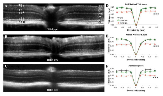 Optical coherence tomography analysis. OCT images for representative 4–6 week-old WT (A), IRBP KO (B), and IRBP Het (C) mice are shown; thickness scales for OCT are represented in (D). Ten marks (+) identify specific layers or layer-boundaries on the retina. OCT analysis of 4–6 week-old mice showed that IRBP KO mice had reductions in (D) FRT, (E) ONL, and (F) PR thicknesses compared to WT and IRBP Het. There were no differences between any of the groups for INL thickness measured at 4–6 weeks. Note: Different y scales for D–F. (*** p < 0.001) (4–6 wks: WT n = 5, IRBP KO n = 9, IRBP Het n = 8; 13–15 months: WT n = 6, IRBP Het n = 4).