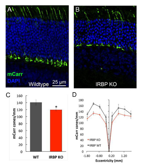 Previous research on IRBP KO mice showed a reduction in the thickness of the outer nuclear layer (ONL), reduced scotopic and photopic electroretinogram (ERGs), and reduced photopic flicker amplitude [24,25,26,27,28,29,30]. Interestingly, one report showed a 30% decrease in the cone populations as measured by a primary antibody for mouse cone arrestin (mCarr) [24], a finding corroborated by other studies measuring peanut agglutinin (PNA), M-opsin, and S-opsin [25,30]. However, another report showed no difference in cone densities measured via PNA staining [28]. IRBP deletion has also been shown to reduce the amplitude and slow kinetics of cone responses without affecting cone adaptation in bright light conditions [31].