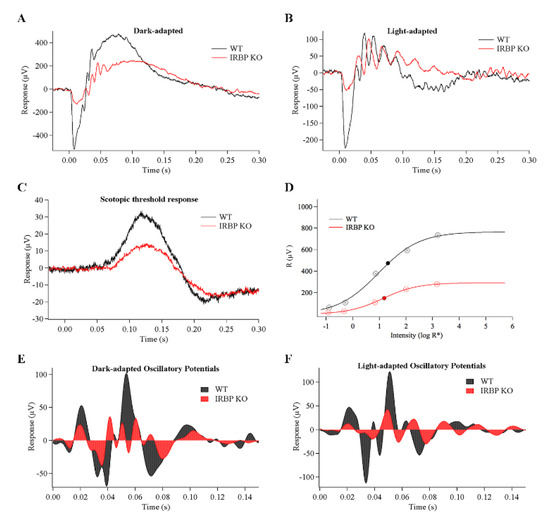 Electroretinogram ERG recordings of 1-month-old WT and IRBP KO mice. (A) Dark-adapted bright flash responses (166,000 R* per rod) and (B) light-adapted responses to a flash of the same intensity (background light 505 nm, 2020 ± 160 R*/rod-s) showed reductions in IRBP KO mice. Average of three responses, AC bandpass filter 1.6–300 Hz. (C) Average scotopic threshold responses (0.14 ± 0.01 R* per rod) show reductions in IRBP KO mice. Average of 20 responses, AC bandpass filter 1.6–300 Hz. (D) Intensity response curves show reduced maximum amplitudes for b-waves of the IRBP KO but no difference in the I ½ compared to WT (black- and red-filled circles). (E) Typical recordings of the dark-adapted and (F) light-adapted oscillatory potentials, isolated from the standard ERG response by band pass filtering (34 to 70 Hz). OP area, demonstrated by the fill-to-zero coloring was measured between 0.015 and 0.15 ms. OP area was reduced in IRBP KO mice compared to WT (Table 1). All mice were 30 ± 2 days old. (WT n = 12, IRBP KO n = 11, IRBP Het n = 7).