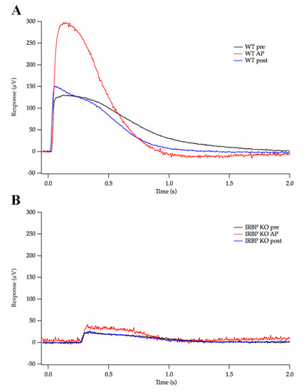 PR responses measured via isolated retina ERG. (A) Representative WT responses to a saturating test flash before (pre), 5 s after (AP), and 215 s (post) after a 3 min conditioning step of light. WT AP responses were double that of the pre response. (B) Representative IRBP KO responses that were significantly lower than WT and showed a four-fold reduction in the level of AP compared to WT. (WT n = 9 trials and n = 4 mice, IRBP KO n = 8 trials and n = 3 mice, IRBP Het n = 17 trials and n = 6 mice).