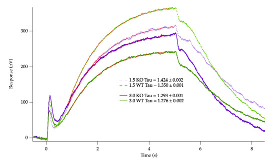 The c-wave responses to 5 s steps of light recorded from WT (green traces) or IRBP KO mice (purple traces). The dims steps (bold solid lines) were in response to 1530 R*/rod/s (3.0), whereas the bright step responses were to stimuli of 42,300 R*/rod/s (thin dashed lines, 1.5). The thin red lines indicate exponential curves fit to the data from 0.8 to 4.95 s s.stimuli (1.46 ± 0.08 s, KO: 1.40 ± 0.11 s; p = 0.42). The IRBP KO mice had c-waves (Figure 5 purple traces) that were very similar to each despite the 28-fold increase in stimulus intensity, while the WT mice showed strikingly different c-wave amplitudes (Figure 5 green traces). A significant difference was seen when the ratios of the dim vs. bright light response c-wave amplitudes were calculated by the higher intensity response and comparing that ratio between groups (WT: 1.59 ± 0.09, KO: 1.13 ± 0.04, p = 0.0004).