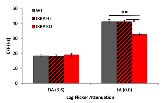 Photopic flicker sweep ERG responses were used to calculate critical flicker frequency. IRBP KO mice show reduced CFF under photopic (0.0 or 1.2 log units attenuation) (red bars) compared with WT (gray bars) or IRBP Het animals (red/black-hatched bars). Stimulus frequencies swept from 0.1 to 30 Hz for scotopic flicker and 0.1–55 Hz for photopic flicker (WT mice n = 12, IRBP KO mice n = 13, IRBP Het mice n = 5). Analyses detailed in methods and Figure S1. * p < 0.05, ** p < 0.005.