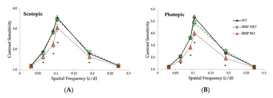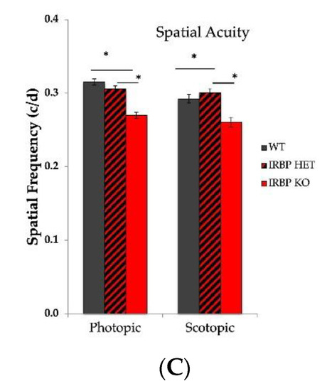IRBP KO mice have reduced scotopic and photopic contrast sensitivity compared to WT and IRBP Het mice (Figure 7A,B). Under scotopic and photopic conditions, there were no differences in contrast sensitivity between WT and IRBP Het mice. One-way ANOVA showed a significant difference in both photopic and scotopic contrast sensitivity (p < 0.05) between the knockout and other groups.