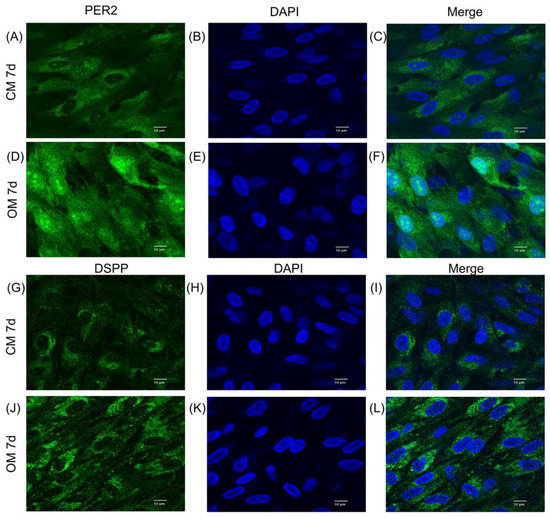 To investigate the impact of differentiation induction on PER2 expression in hDPSCs, the cells were cultured in either control medium (CM) or odontoblastic/osteogenic medium (OM) and harvested on day 7. Compared to cells cultured in CM (Figure 3A–C,G–I), hDPSCs cultured in OM exhibited a dramatic increase in PER2 and DSPP immunofluorescence staining (Figure 3D–F,J–L). Additionally, PER2 was observed to localize in both the nucleus and cytoplasm of OM-cultured hDPSCs (Figure 3D–F), whereas in CM-cultured cells, it predominantly resided in the cytoplasm (Figure 3A–C).